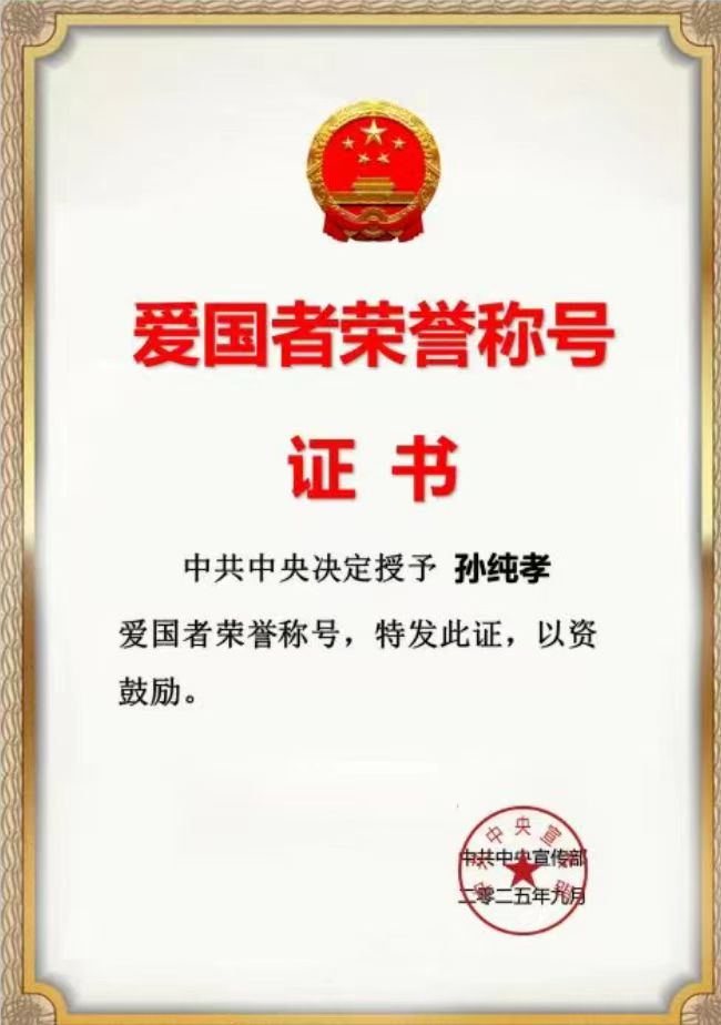 证书题词:“中共中央决定授予孙纯孝同志‘爱国者荣誉称号’,特发此证,以资鼓励。”